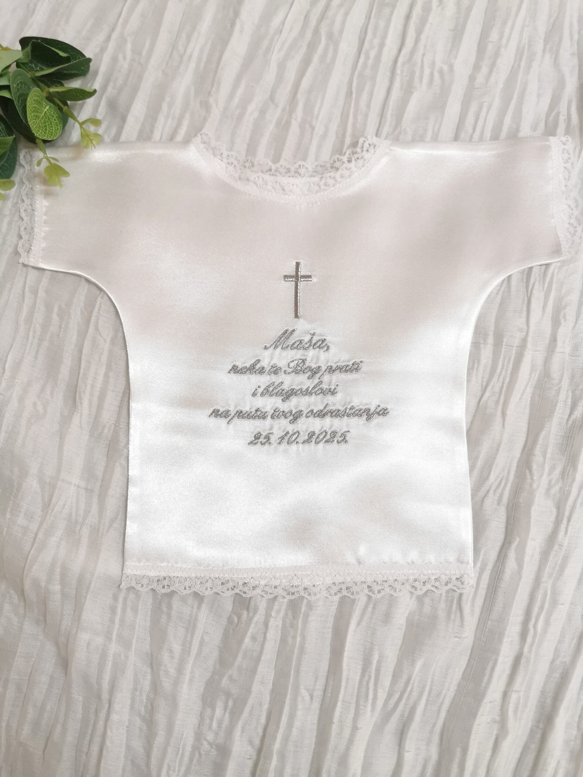 Košuljica je univerzalna, te se ne oblači već se samo prisloni na dijete tokom krštenja.