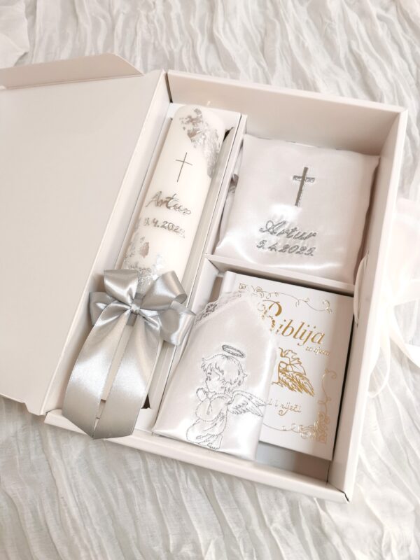 Budite spremni za velik dan Vašeg mališana. Izaberite između velike ponude krsnih kompleta. Svi naši krsni kompleti, kao i pojedinačni proizvodi za krštenje nude velik broj opcija, od motiva, boja pa sve do natpisa. Tako možete birati razne motive na krsnim košuljicama i rupčićima, natpise različitih boja, te boje koje će se nalaziti na svijeći. Naše krsne svijeće ručni su rad, te svaka od njih može biti personalizirana i jedinstvena. Sve zbog toga kako bi Vi mogli izabrati savršen krsni komplet za Vaše dijete.