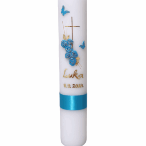 Svijeća: napravljena je od kvalitetnog parafinskog voska, ručno rađenih ukrasa i detalja prilagođenim Vama kako bi Vašem djetetu ostala trajna uspomena na tako poseban i velik dan!